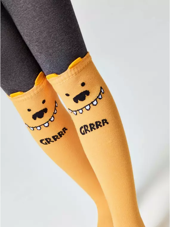 Мягкие эластичные удобные и практичные детские колготки из хлопка, с рисунками-мордашками и декоративными элементами на ножках в виде ушек.
