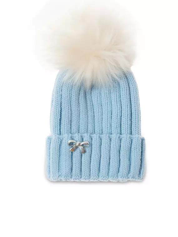 Шапка детская трикотажная с вывязанным и стянутым верхом с отворотом. Основное переплетение ластик 3+3. Шапка с меховым помпоном и с декором в виде металического бантика.