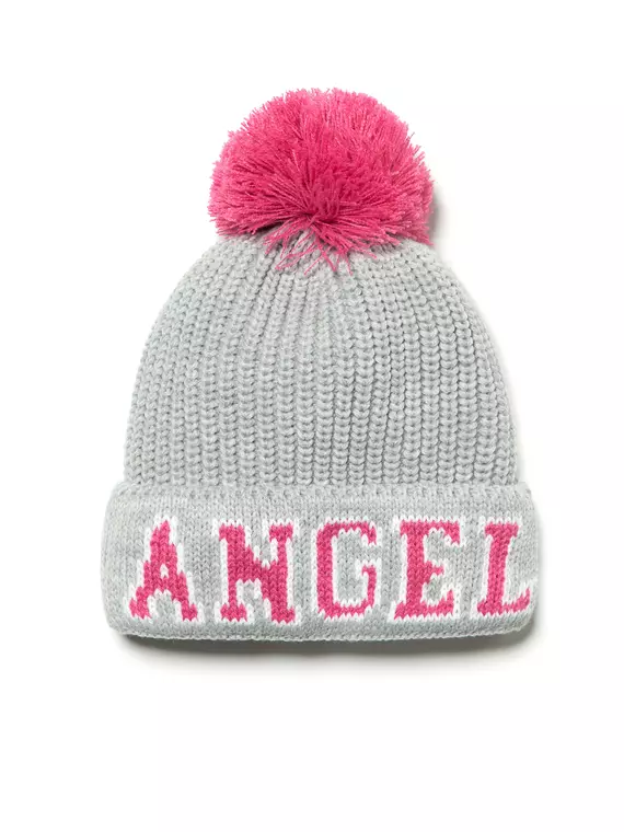 Шапка с отворотом и фактурным узором, имитирующим ручное вязание. Яркий помпон из трикотажных нитей, вывязанная надпись «ANGEL». Связанапереплетением полуфанг.