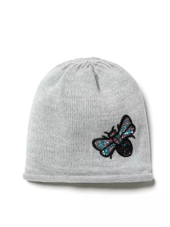 Прилегающая шапка с закрученным нижним краем и сияющей декоративной термоаппликацией.