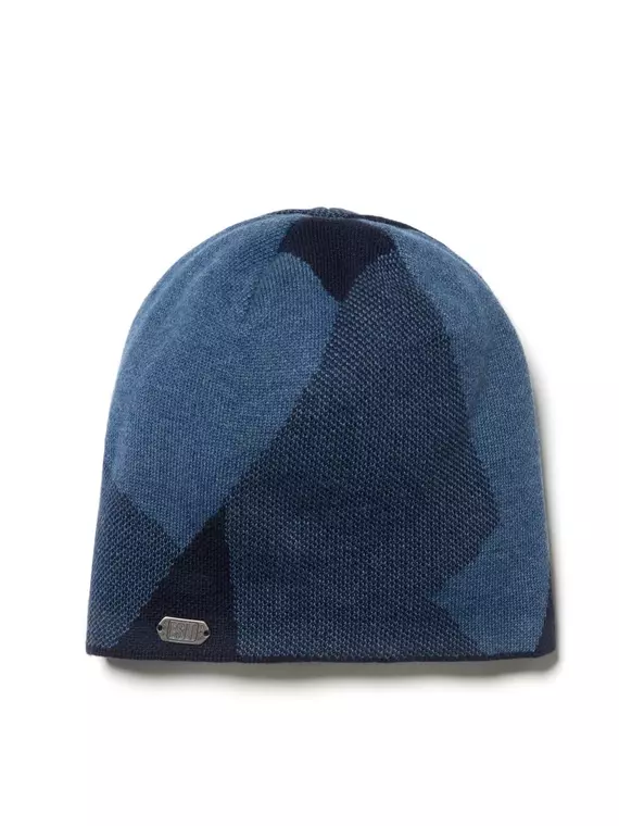 Двойная шапка с абстрактным рисунком и пришивным металлическом декором ESLI. Связана жаккардовым переплетением.