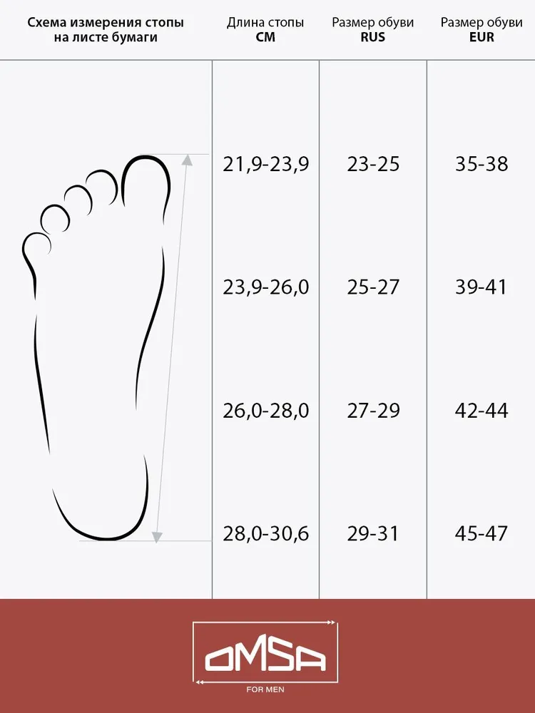 - Размеры: 36-38 (23-25), 39-41 (25-27), 42-44 (27-29), 45-47 (29-31)