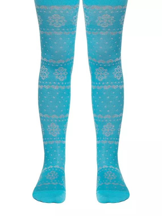 Мягкие эластичные удобные и практичные тонкие детские колготки из хлопка и вискозы, с жаккардовыми рисунками, вывязанными блестящей вискозной нитью. Для девочек.