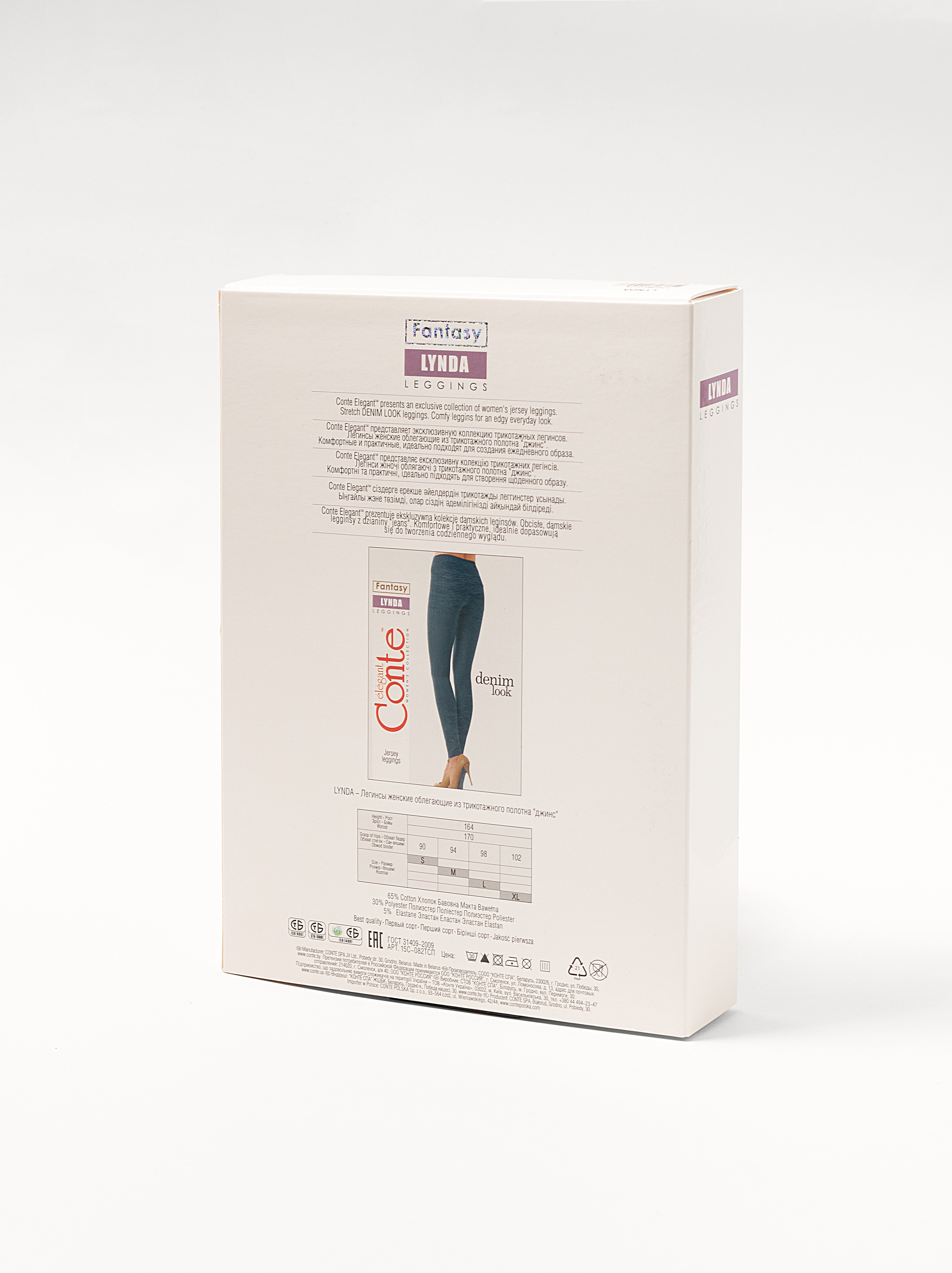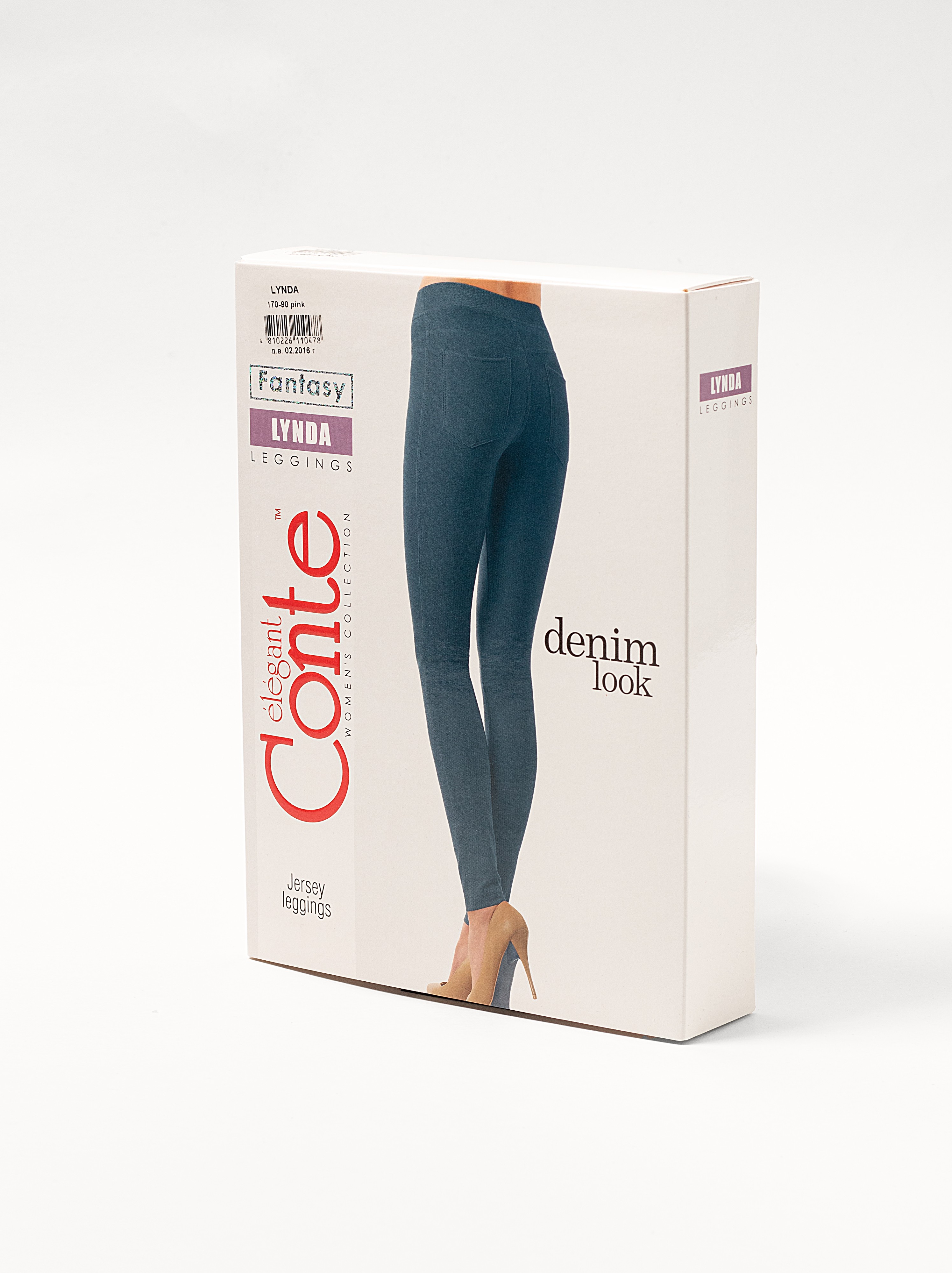 Легинсы женские облегающие из трикотажного полотна "джинс". По переду изделия - имитация гульфика и боковых карманов. По спинке - кокетки и накладные карманы с вышивкой. Верх изделия обработан широким поясом с широкой резинкой внутри.