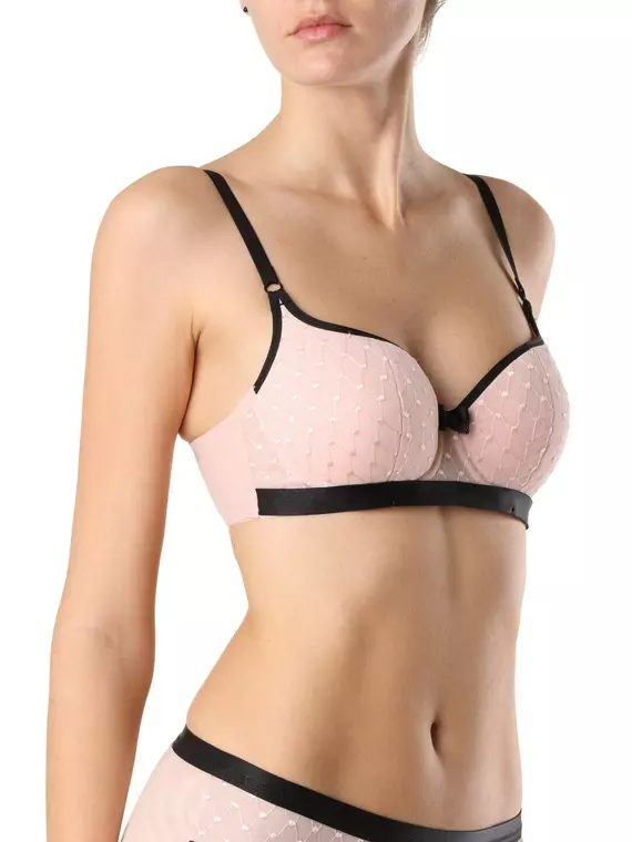 Чашка с вертикальным членением на дубляже с хлопком. На каркасах. Австрийская вышивка на эластичной сетке. Широкие контрастные тесьмы в стиле спорт-шик. Декор в виде бантиков с кружевным элементом. Регулируемые бретели. Создаёт соблазнительную линию декольте. Подходит на средние размеры. Чувственное белье, выполненное в лучших традициях французского стиля.