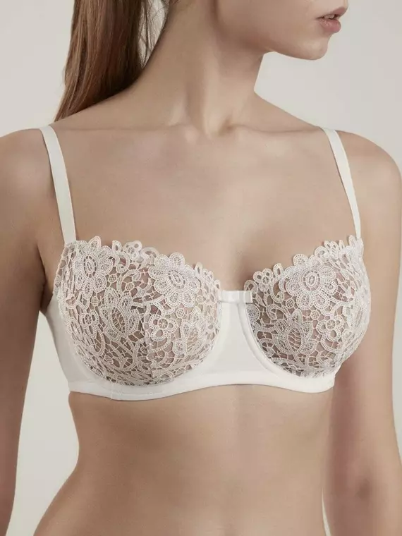 • мягкая чашка с вертикальными членениями • на каркасах • неэластичная подкладка для хорошей поддержки груди • боковые детали стана на подкладке • регулируемые бретели • оригинальная вышивка, напоминающая технику макраме • красивый естественный объем • создан для нежных бельевых образов.