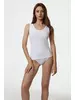 Майка женская из эластичного трикотажного полотна. Горловина и проймы окантованы.