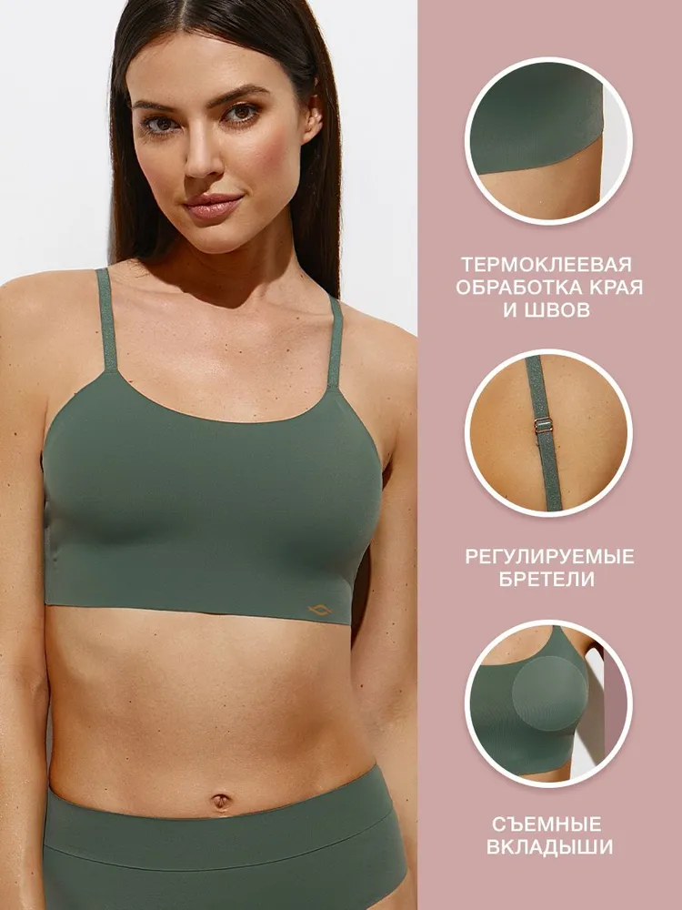 Женский кроп-топ Omsa Invisible 1112B Militari с декоративной сеткой и оригинальным дизайном спины. Модель из гладкой микрофибры с эластичными сетчатыми вставками создает эффектный силуэт с округлой формой груди. Технология плоских клеевых швов обеспечивает бесшовный эффект и идеальную посадку. Съемные формованные вкладыши позволяют регулировать объем и поддержку.