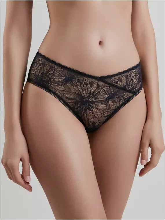• слип • средняя линия талии • изысканное итальянское цветочное кружево • сетка в горошек • верхний срез передней детали с имитацией запаха • нижние срезы обработаны плоским швом для незаметности под одеждой • сохранение формы и цвета при соблюдении рекомендаций по уходу.