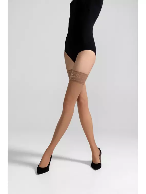Ультратонкие чулки из мультифиламентных нитей с ажурной самоподдерживающейся эластичной резинкой.