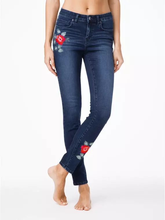 Модель зауженного кроя со средней посадкой. Классический темный деним с яркими и стильными акцентами в виде вышивки. Эта модель отлично садится по фигуре и обрисовывает силуэт. Очень нежная и романтическая вышивка станет украшением любого гардероба, подчеркнет нежность и очарование женщины.