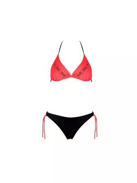 Купальный костюм для женщин комбинированный из трикотажного полотна. Бюстгальтер перфорированный на подкладке треугольной формы с уплотненными чашечками в комплекте, завязывается на спине. Бретели бюстгальтера - регулируемые (завязываются сзади на шее). Плавки - бикини на подкладке с завязками по бокам, на завязки надеты декоративные наконечники.