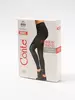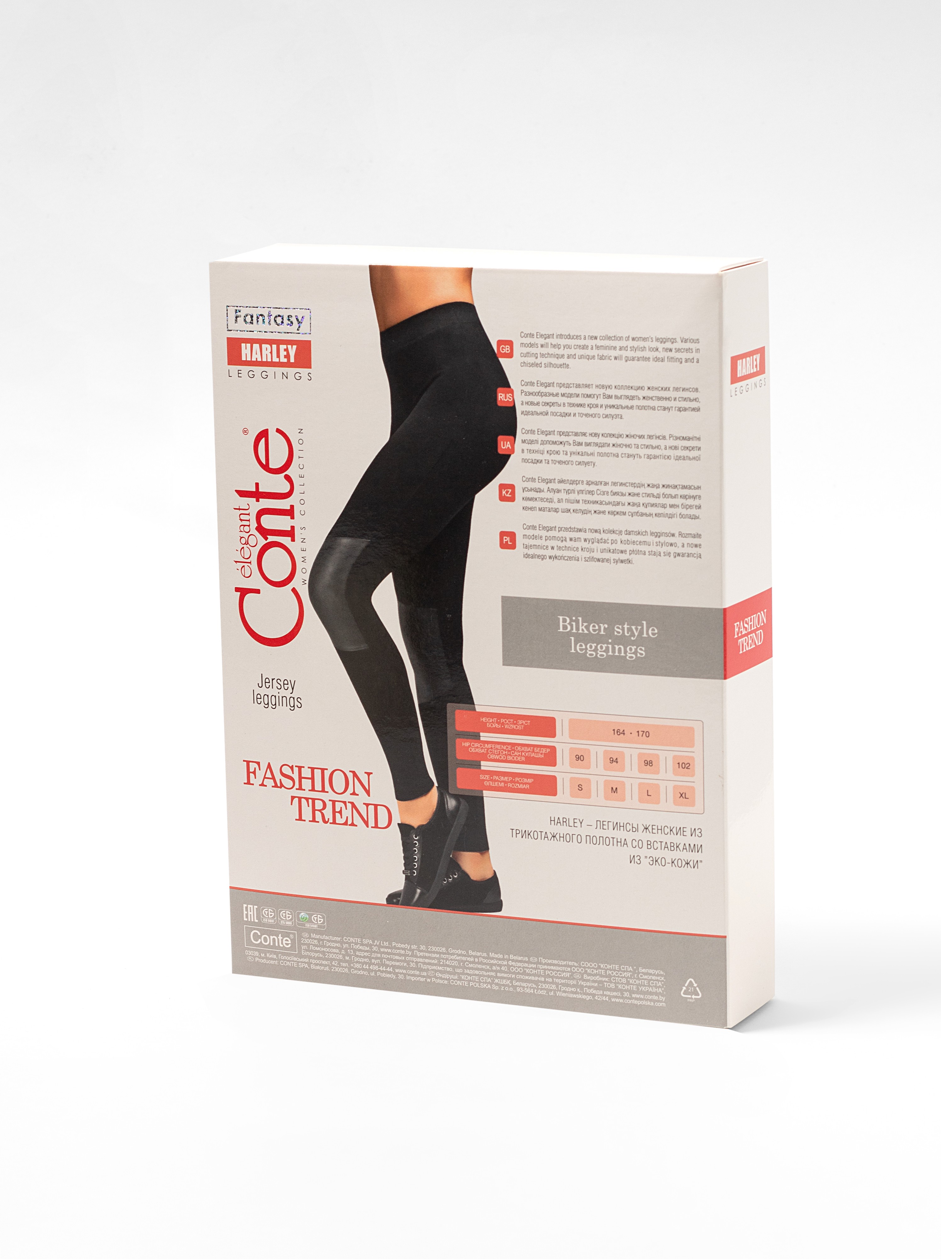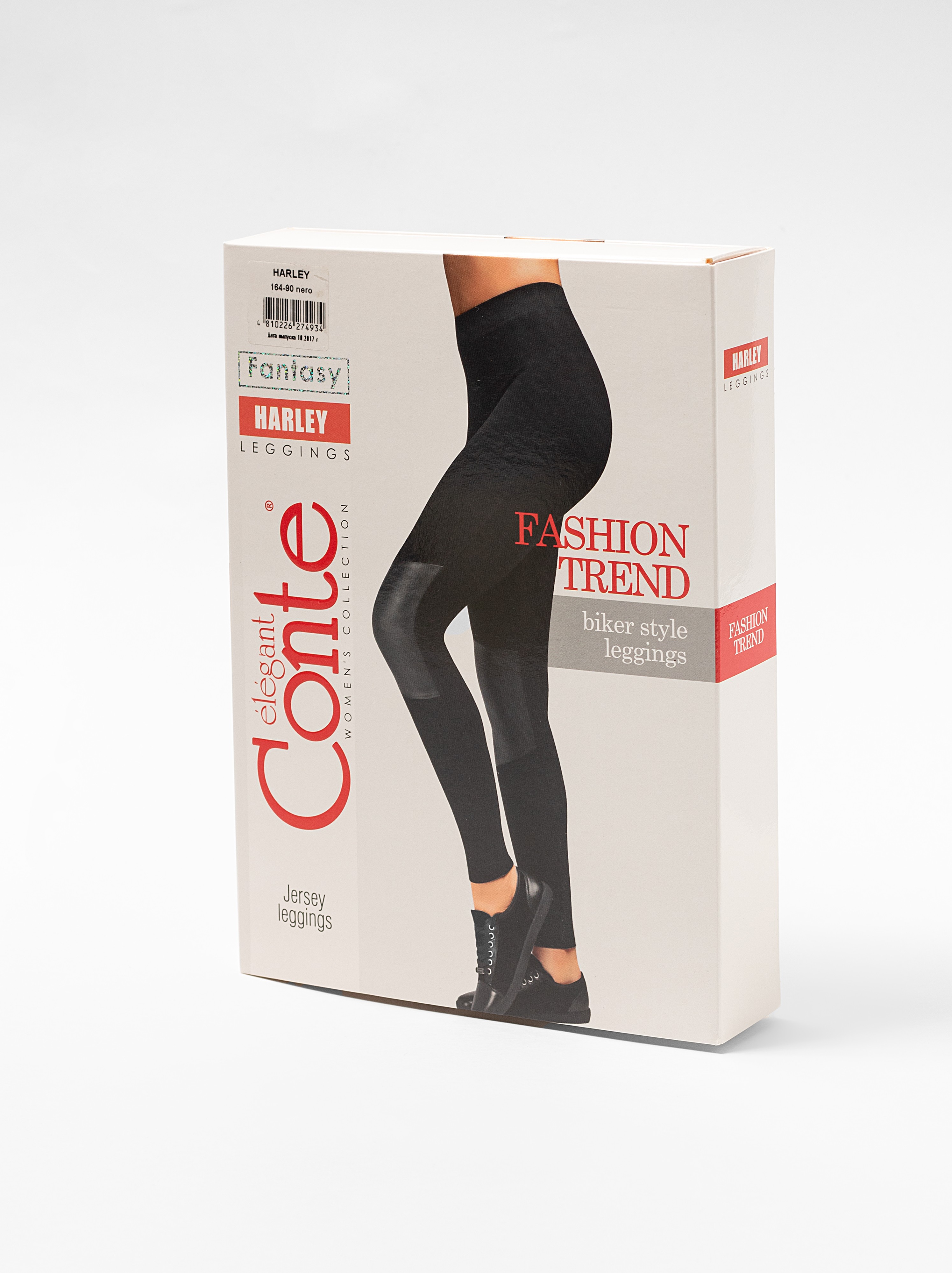 Легинсы женские из трикотажного полотна. По передним половинкам на уровне колена отделочная деталь из искусственной кожи. По швам притачивания отделочной детали выполнены отделочные строчки с узкой расстановкой игл. Верх изделия обработан поясом с широкой резинкой внутри. По шву притачивания пояса выполнена узкая отделочная строчка.