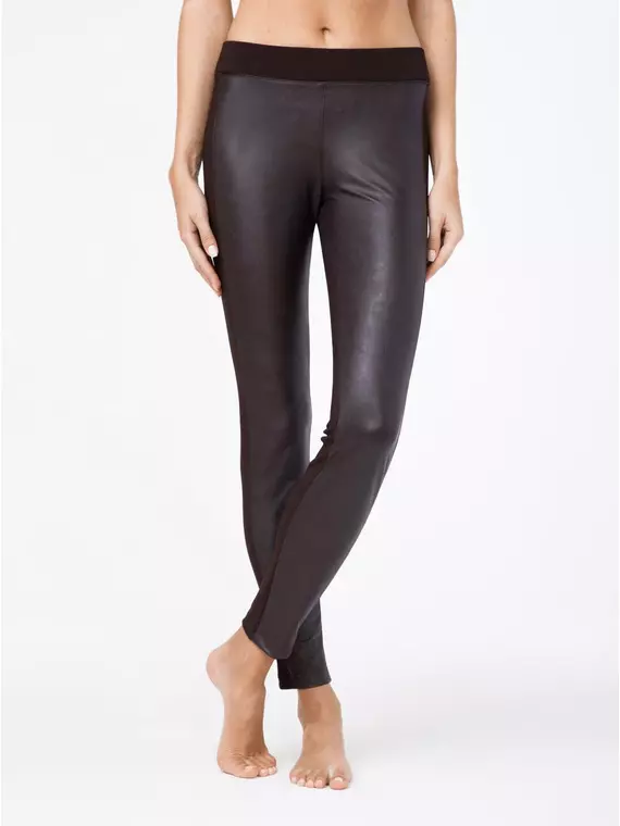 Леггинсы женские из эластичного полотна с кожаной вставкой по передней части изделия. По боковым швам, швам притачивания кожаной вставки, швам сидения - отделочные строчки. Верх изделия обработан широким поясом с резинкой внутри. На левой ножке, по шву притачивания кожаной вставки - декоративное украшение с логотипом.