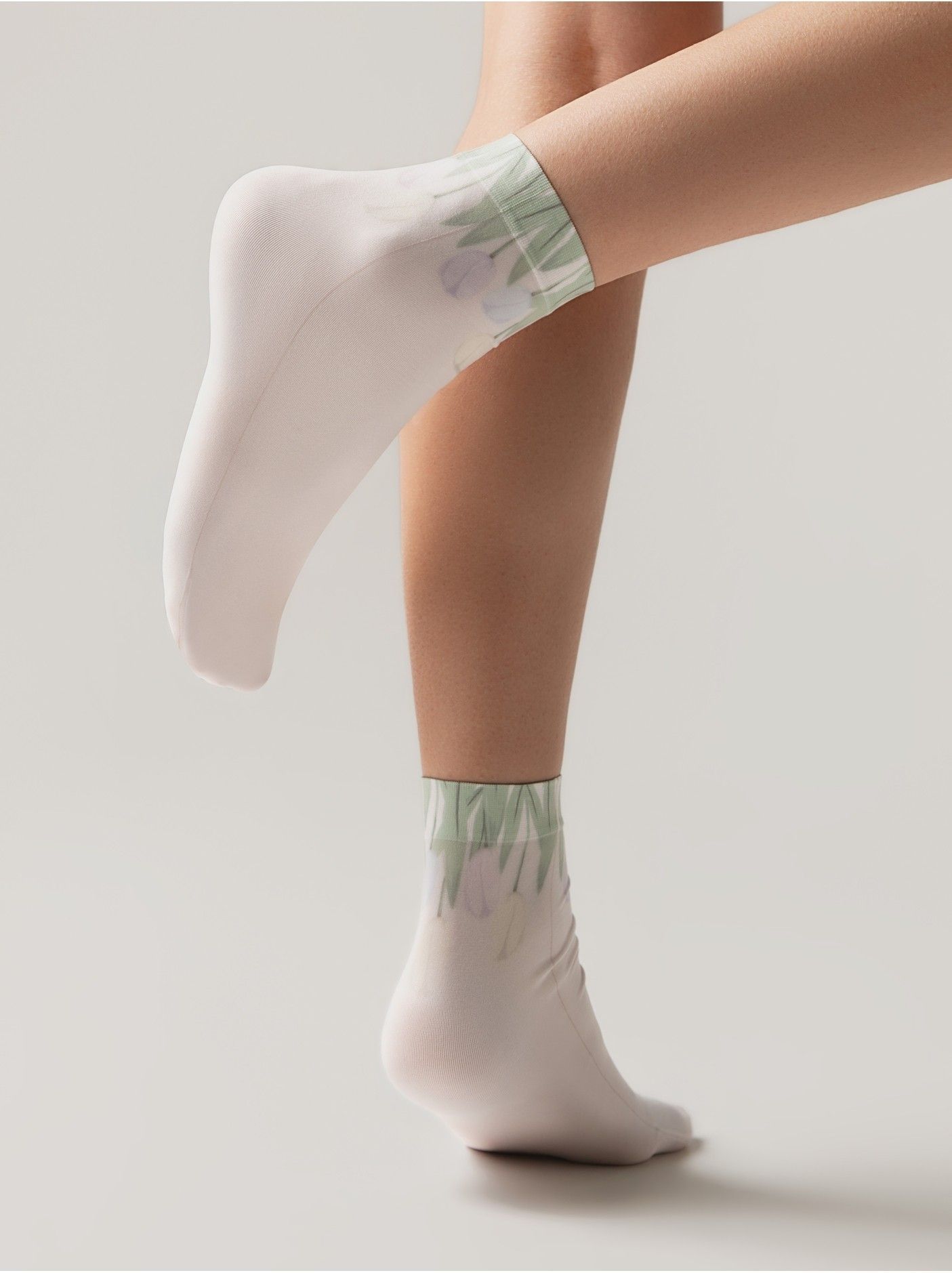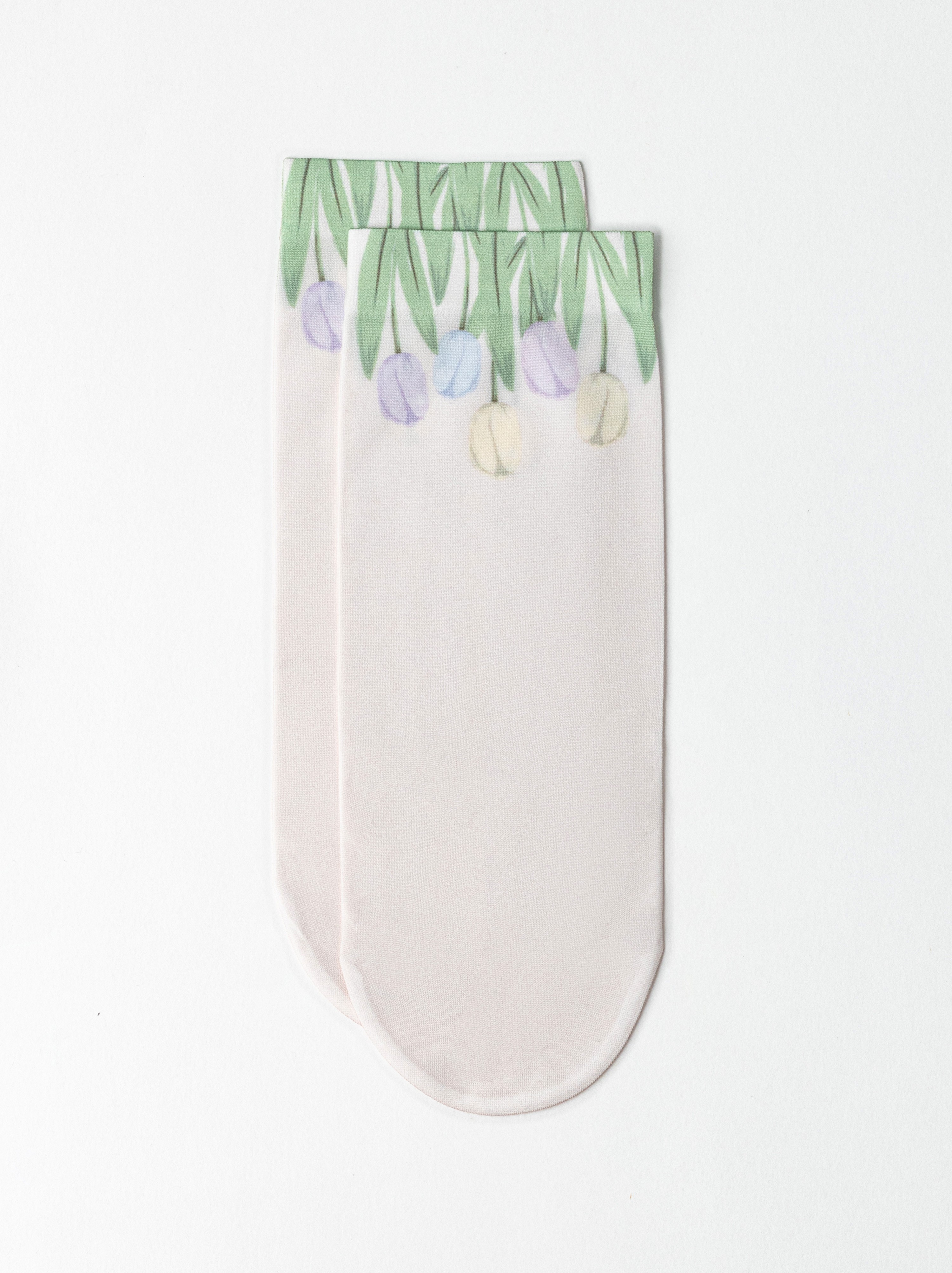 - Яркий дизайн «Тюльпаны» — весеннее, жизнерадостное настроение в каждой паре, рисунок микс (разноцветные тюльпаны на светлом фоне) добавит индивидуальности любому образу.