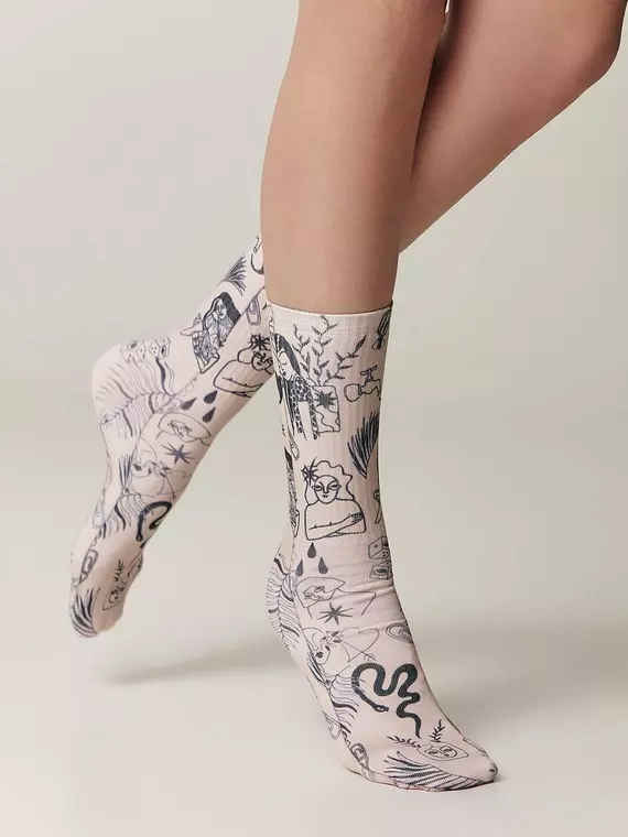 Удлиненные хлопковые носки с печатными рисунками FANTASY добавят яркую изюминку в образ. Носки плотно облегают ногу и не сползают благодаря эластичному рельефному паголенку-резинке.
