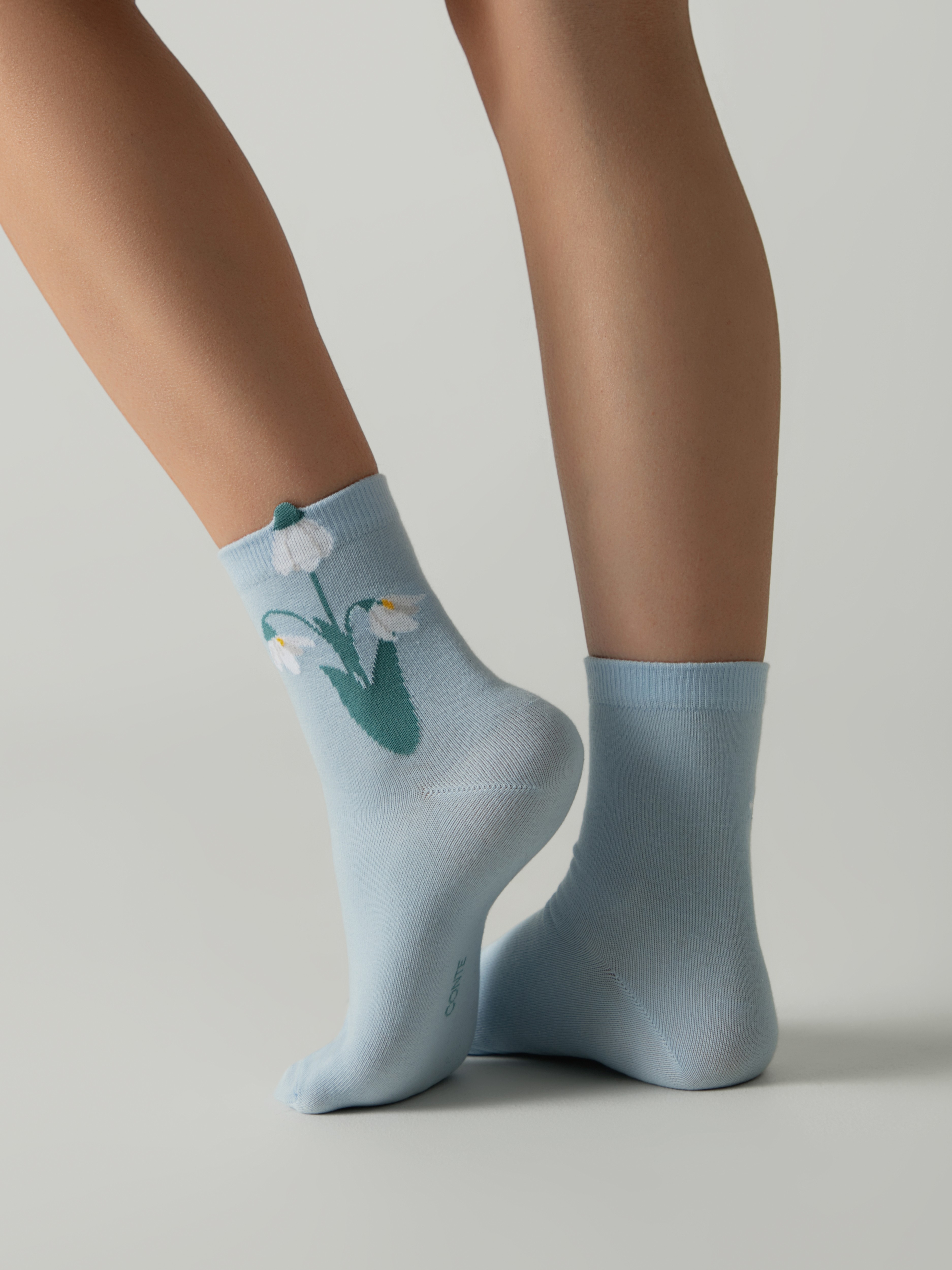 Удлинённые носки женские из хлопка с пикотом «Подснежник» CONTE CLASSIC 1138 светло-голубой — это нежный весенний аксессуар, созданный для романтичных и стильных образов. Модель из мягкого натурального хлопка дарит ногам комфорт и ощущение свежести, а главной изюминкой дизайна становится изящный пикот в виде цветка подснежника, расположенный на задней части носка. Светло-голубой оттенок напоминает о первых весенних днях и легко сочетается с пастельной гаммой одежды, делая эти носки идеальным выбором для повседневной носки в межсезонье.